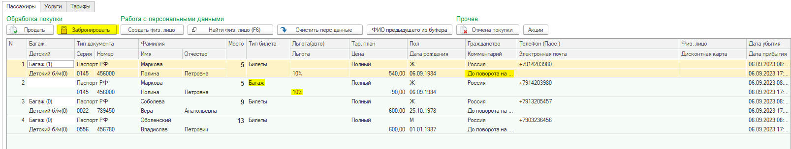 Перейдите во вкладку Продажа билетов. Выделите места, на которые планируется посадка пассажиров, нажмите Enter.