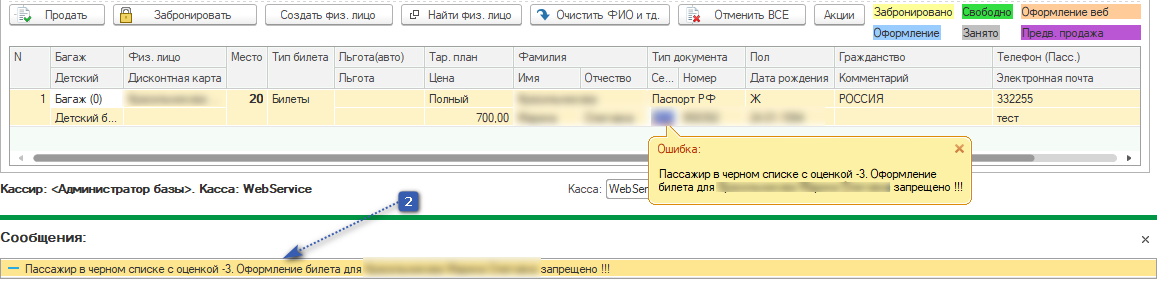 Находим в списке нужного пассажира и открываем его двойным кликом. В поле оценка пишем оценку при которой будет невозможна продажа билета пассажиру.