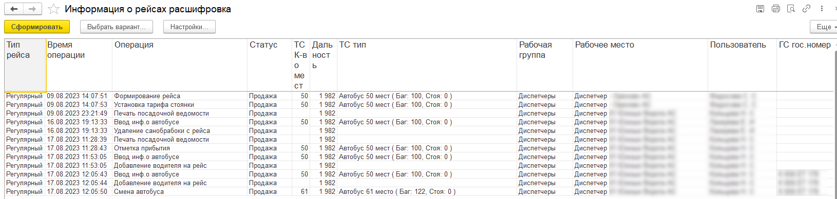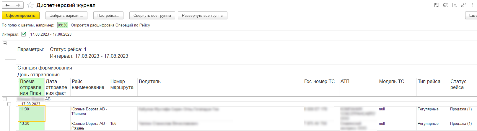 Диспетчерский журнал Диспетчерский журнал - показывает рейсы, сведения об АТП, водителе и ТС, статусе рейса на один день, применительно к станции отправления. Если щелкнуть по зеленому полю, то можно получить развернутую информацию по рейсу.