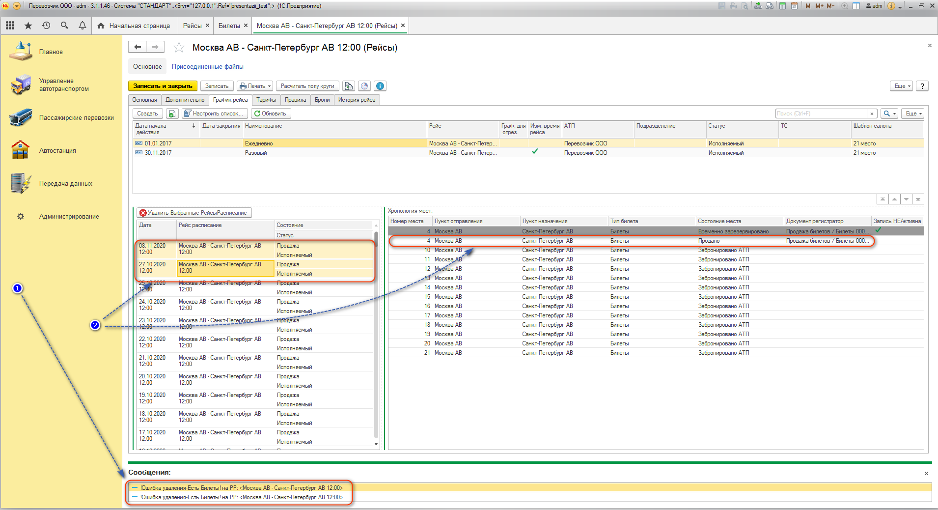 1. Сообщение системы "Ошибка удаления: Есть билеты!" - сообщение о расписаниях, на которых имеются действиях с местами (брони и/или продажи)
