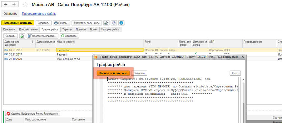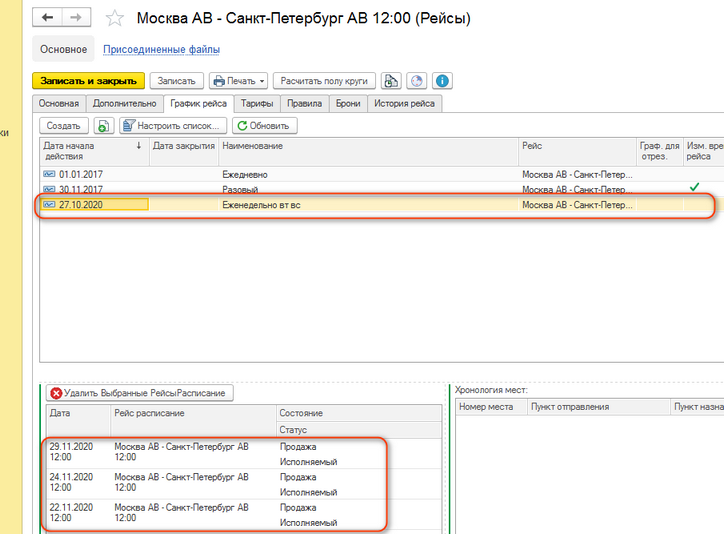 Рассмотрим на примере. Есть рейс Москва АВ - Санкт-Петербург АВ 12:00 с ежедневным графиком движения, расписание формируется автоматически на 30 дней вперед. Сегодня 21 октября, среда. Со следующей недели (с 26 октября) график по эту рейсу становится следующим: вторник и воскресенье. Необходимо закрыть имеющийся ежедневный график и создать новый с датой первого выезда 26 октября.