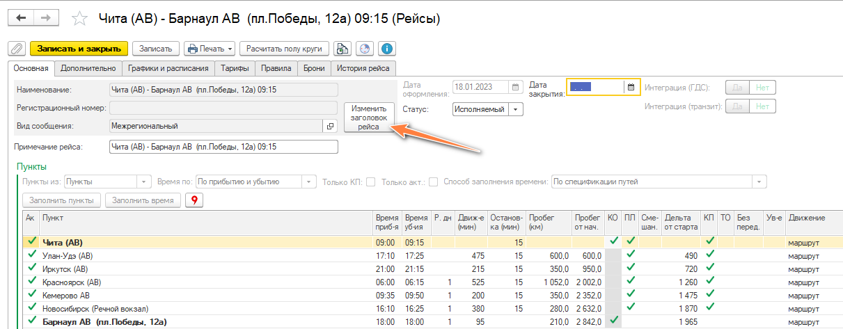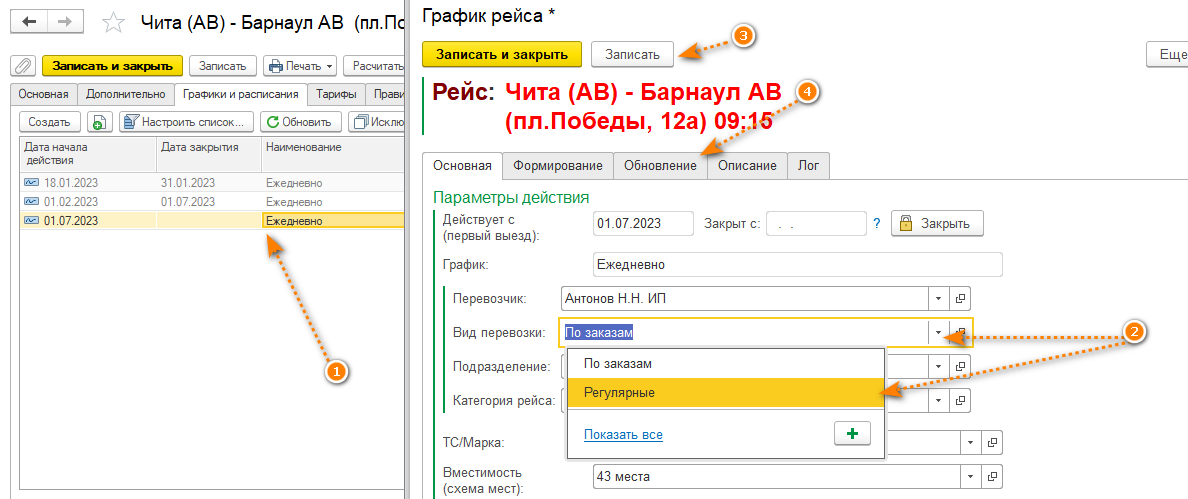 После этого необходимо изменить сведения по виду перевозки в Графике и обновить расписание.