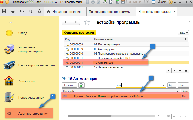 2. "Настройки" далее "16 Автостанция".