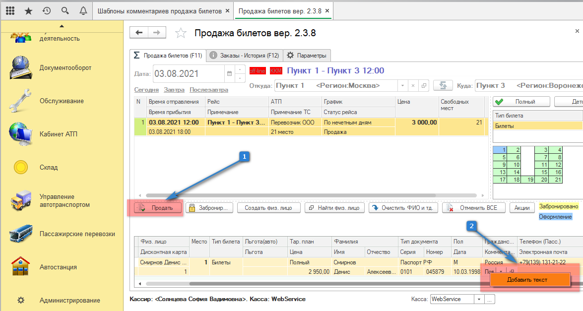 2. Если же нам нужно изменить шаблон, то нажимаем правой кнопкой мыши на ранее выбранный комментарий, далее нажимаем "Добавить текст", прописываем дополнительную информацию, далее продаем билет.