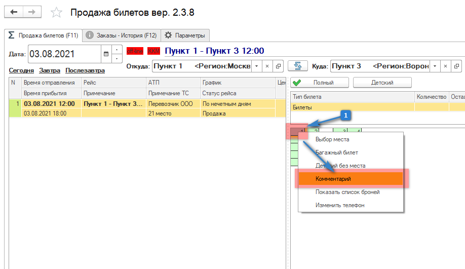 1. Если же билет был уже продан, то добавить комментарий можно нажав на место правой кнопкой мыши, далее выбрать "Комментарий".