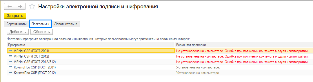 Вы должны понимать, что криптографические программы КОНФЛИКТУЮТ друг с другом и ЭЦП не будет работать, если на ПК будут установлены обе программы.