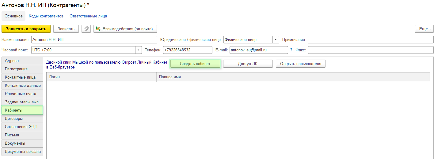 Откройте карточку контрагента. Вкладка Кабинеты - Создать кабинет