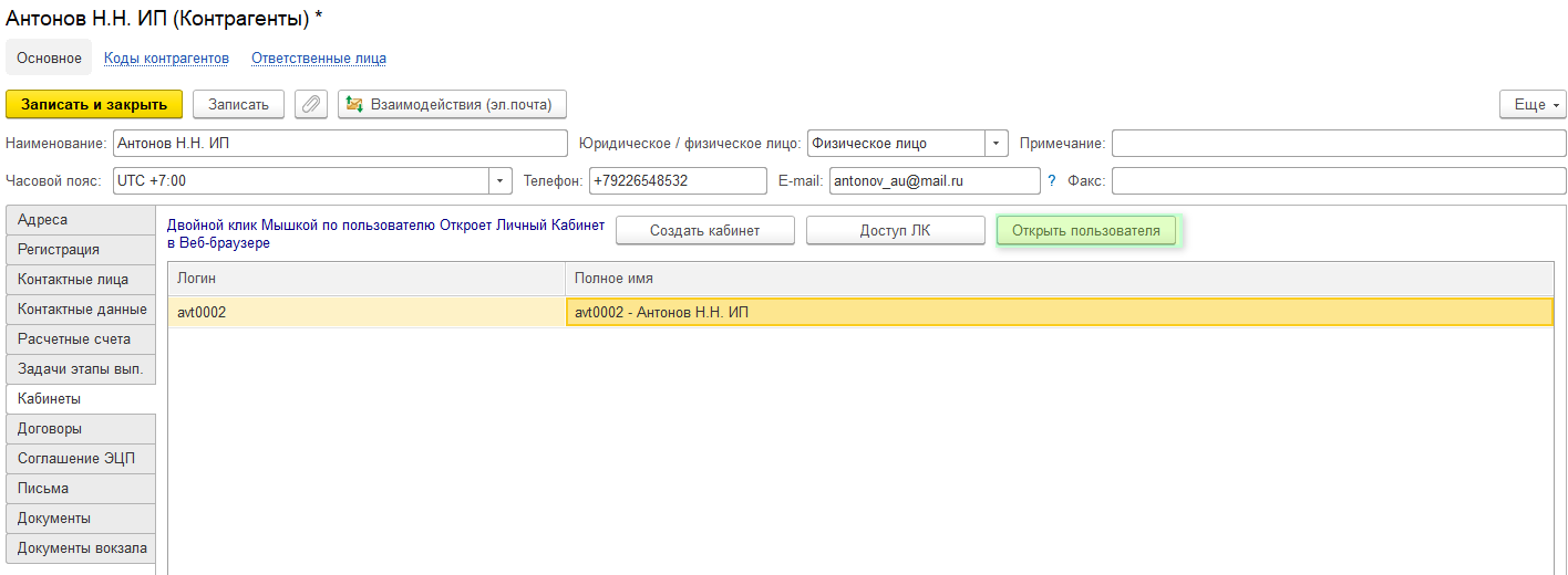 После внесенных изменений необходимо записать и закрыть карточку пользователя. Вернитесь в карточку контрагента для отправки сведений об открытом ЛК перевозчику. Нажмите кнопку Доступ к ЛК и скопируйте информацию, перешлите ее перевозчику на почту.