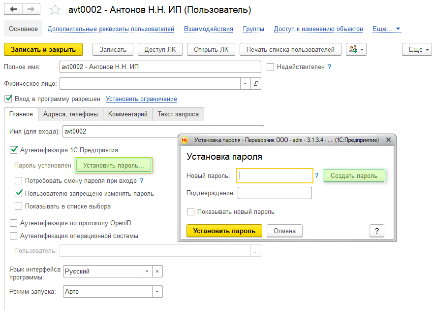 В карте пользователя нажмите Установить пароль, через кнопку Создать пароль можно сгенерировать индивидуальный и безопасный пароль. Скопируйте его и вставьте в строки Новый пароль и Подтверждение. Нажмите кнопку Установить пароль.