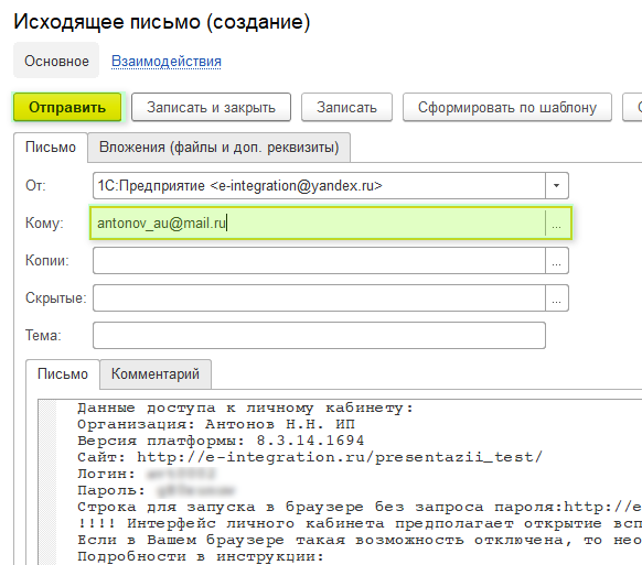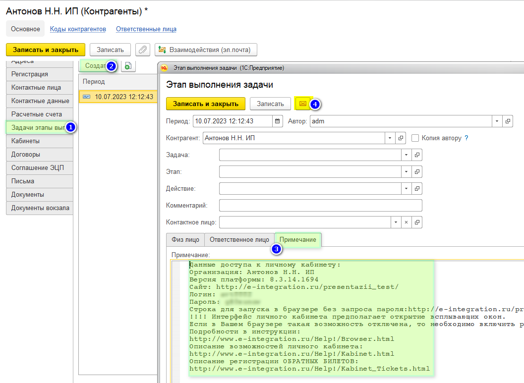 Вкладка Примечание вставить информацию по ЛК, нажмите Записать и нажмите на символ письма.