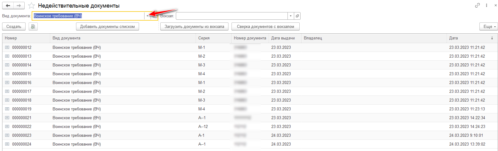 Таким образом Вы увидите список ранее внесенных, вручную или загруженных из вокзала, документов данного вида.