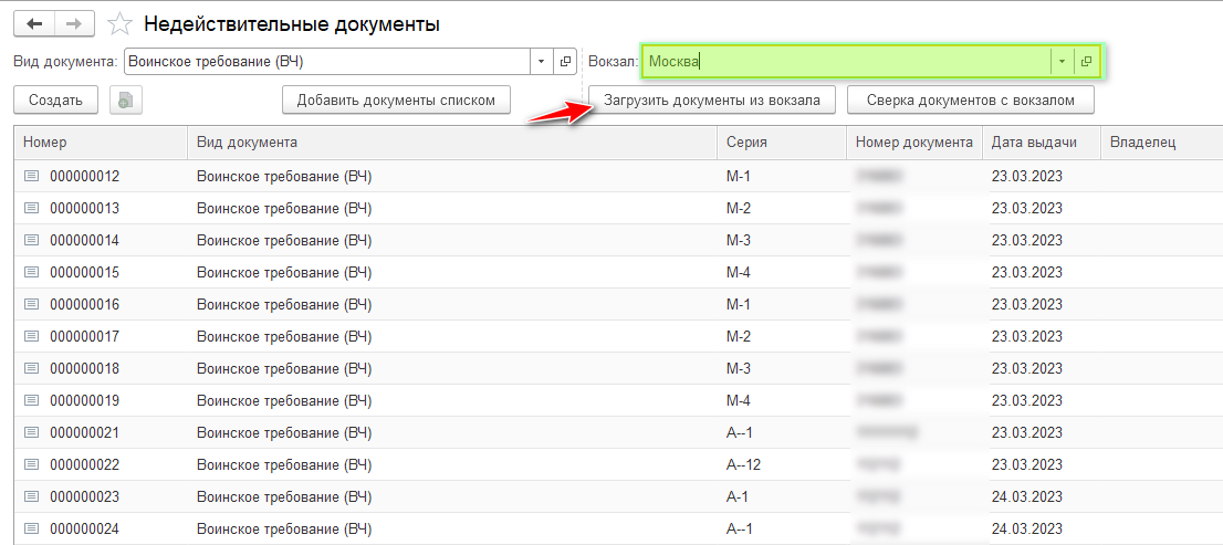 Так же можно подгрузить актуальный список документов из вокзала. Выберите нужный Вокзал. Нажмите кнопку Загрузить документы из вокзала.