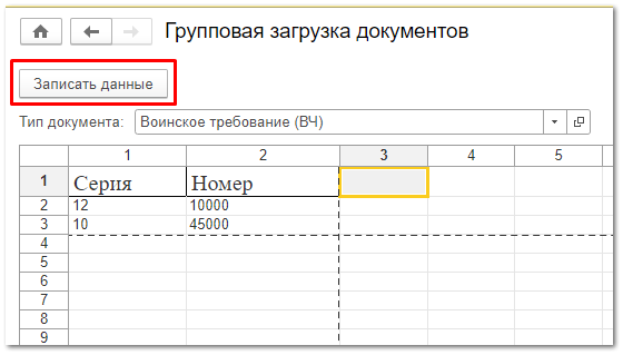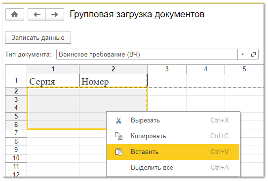 Кнопка Добавить документы списком позволяет создать группу записей в справочнике. Предполагается, что у Вас уже есть сформированный файл в формате Excel с заполненной табличной частью. Скопируйте столбцы с информацией в буфер обмена (Ctrl+C или ПКМ, команда "Копировать") .