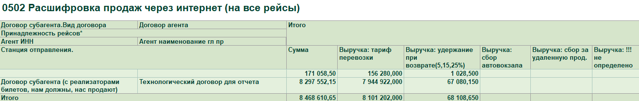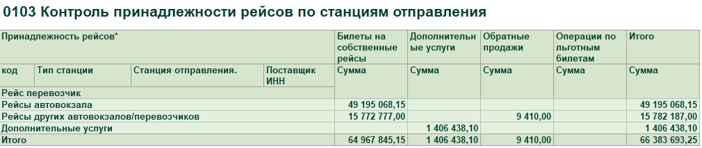Отобраны операции с чужими рейсами , в т.ч. продажи через интернет, за исключением прочих касс (продаж, совершенных непосредственно перевозчиком на свои рейсы) и сайта. Сайт исключен по причине того, что в системе автовокзала отражается только часть продаж .