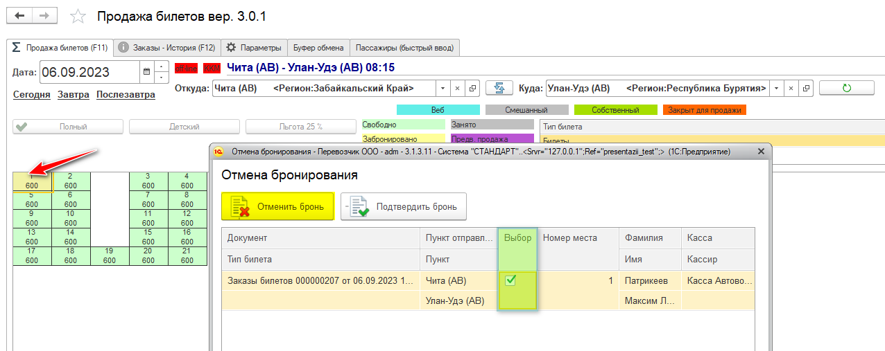 Зайдите в форму продажи на нужный день. Двойным щелчком нажмите на забронированное место.