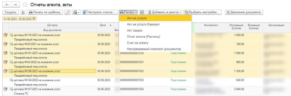 Выделите мышью один или несколько документов, нажмите кнопку Печать, выберите необходимую печатную форму документа.