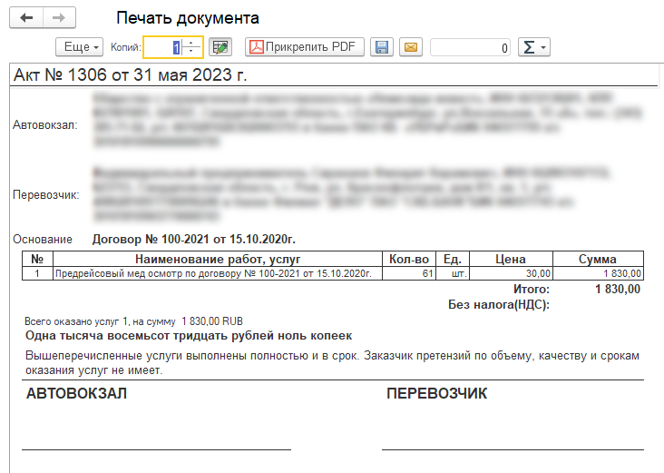Печатную форму можно просмотреть, отредактировать (кнопка карандаш), вывести на принтер или прикрепить PDF вариант к документам данного контрагента.