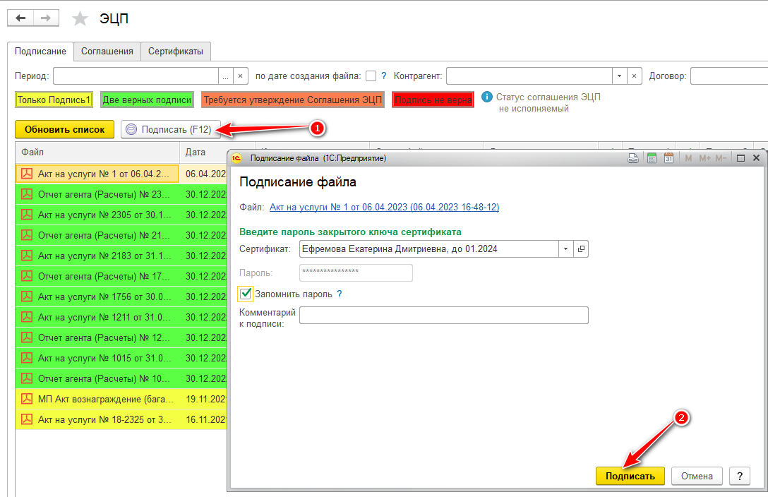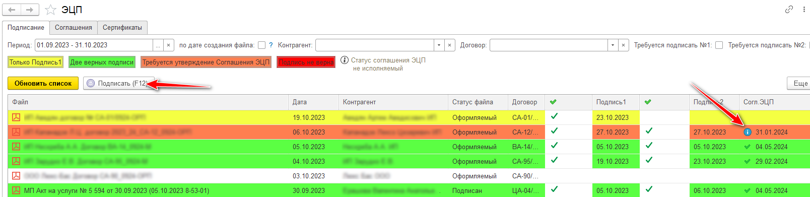 Подписывать можно либо один документ, либо группу документов. Выделите одну или несколько строк (удерживая Shift), нажмите кнопку Подписать.