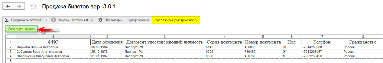 Когда откроется форма продажи билетов нажмите кнопку ФИО предыдущего из буфера.