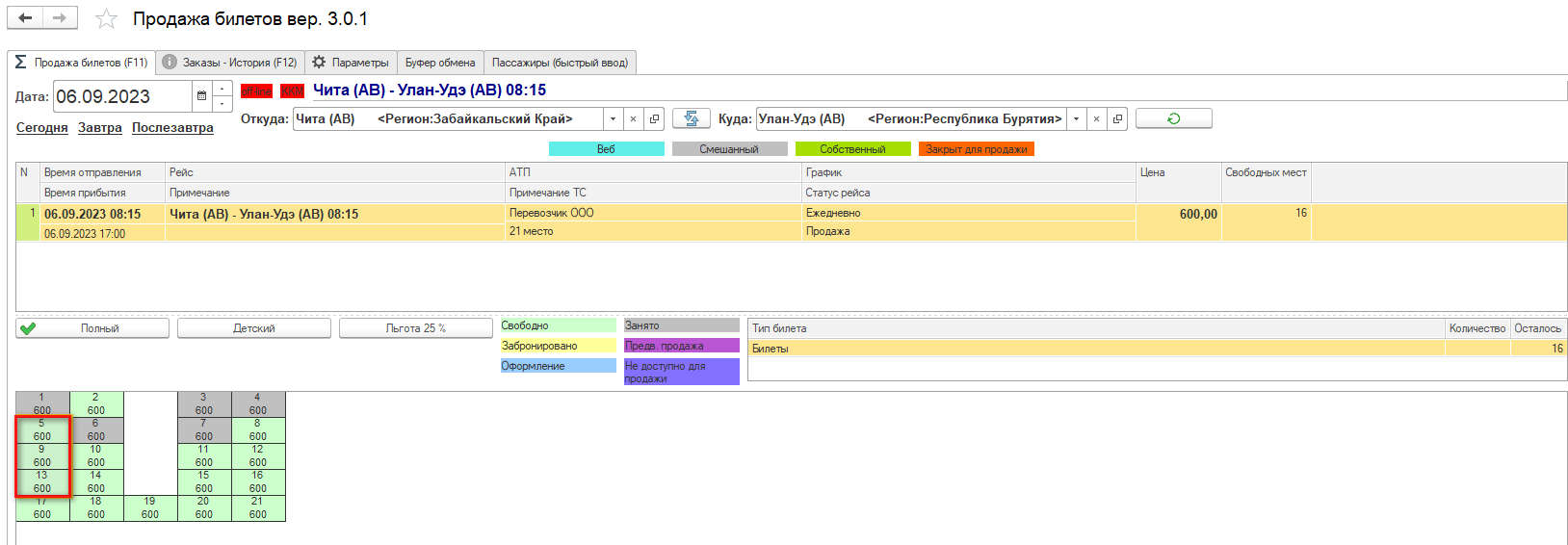 Перейдите во вкладку Продажа билетов. Выделите места, на которые планируется посадка пассажиров, нажмите Enter.
