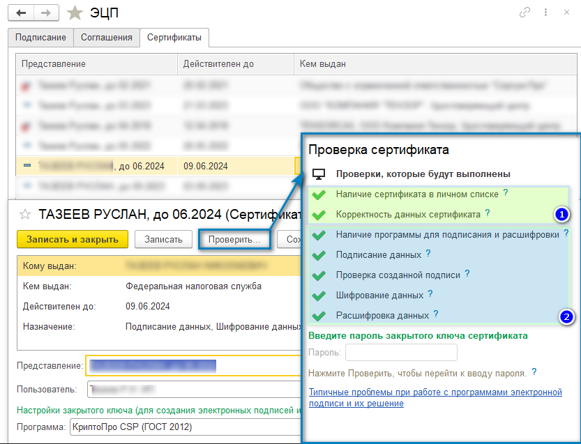 5) прикреплен ли сертификат в хранилище криптопрограммы?