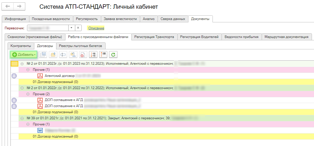 Вкладка Договоры отображает все договоры, дополнительные соглашения, что заключены между перевозчиком и вокзалом.