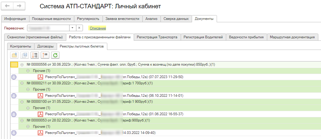 Вкладка Реестры льготных билетов отображает все документы по перевезенным льготным пассажирам. Эти документы можно скачать на ПК, щелкнув двойным щелчком по документу.