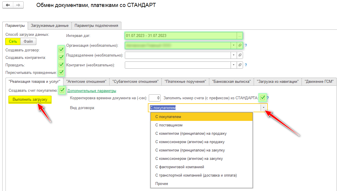 - создавать договора - позволяет создать договор для контрагента, если его нет в Бухгалтерии (на основании договора из СТАНДАРТА)