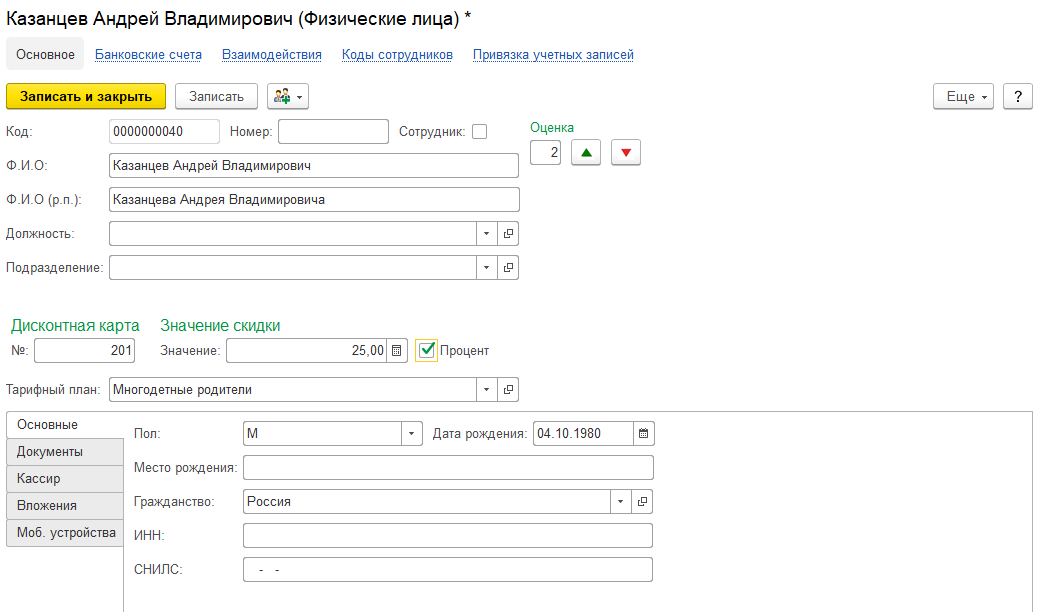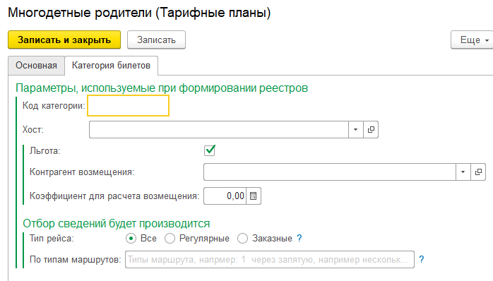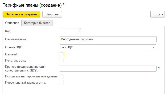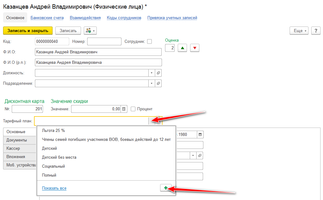 Для граждан у которых уже имеется карточка физ.лица в программе, можно установить программы лояльности.  Создайте свой тарифный план, укажите наименование и поставьте отметку, что это льгота.  Скидка может быть как в фиксированной сумме (значение), так и в процентном соотношении к базовому тарифу. Для расчета в проценте надо поставить отметку Процент.