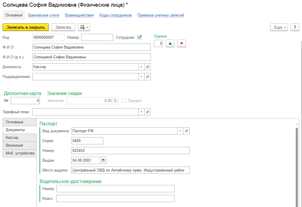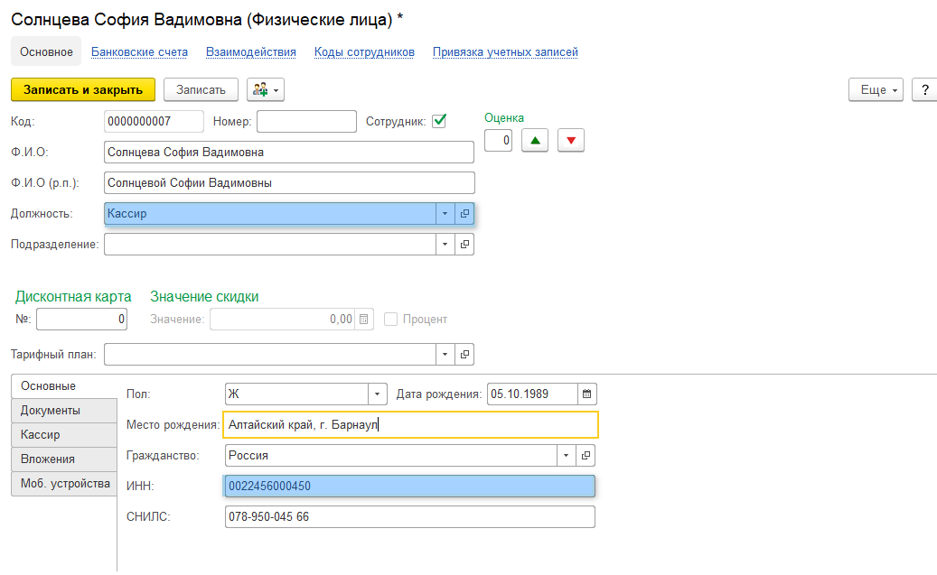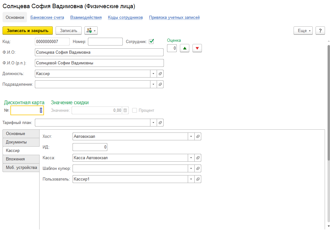 Вкладка Кассир. Заполняется для кассиров, указывается рабочее место кассира и касса, за которой сотрудник закреплен.