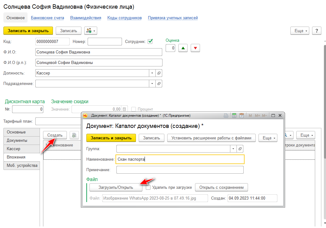 Вкладка Вложения. Хранит электронные версии документов сотрудников: сканы паспорта, водительского удостоверения, сертификатов и т.д.