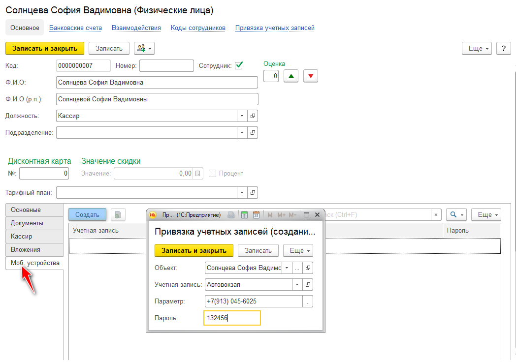 Вкладка Мобильные устройства. Заполняется только для сотрудников, которые работают по мобильному приложению.