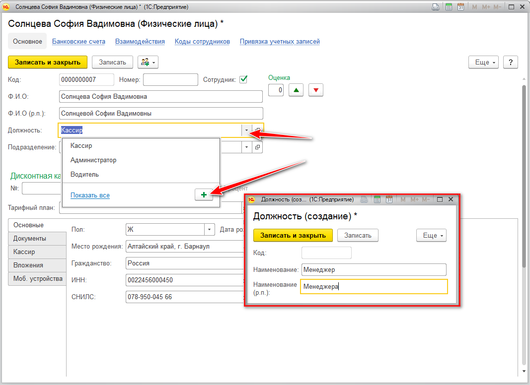 Чтобы создать новую должность нажмите на выпадающее меню в конце строки, иконка "Добавить" и запишите новую специальность: