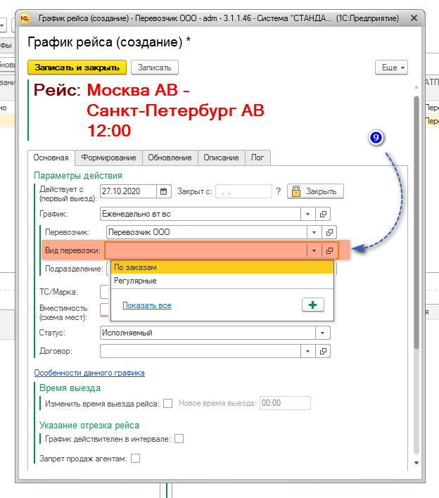 Указать Вид перевозки (если есть карта маршрута, то выбираем "регулярные" вид перевозки, если нет карты маршрута - то "по заказам"):