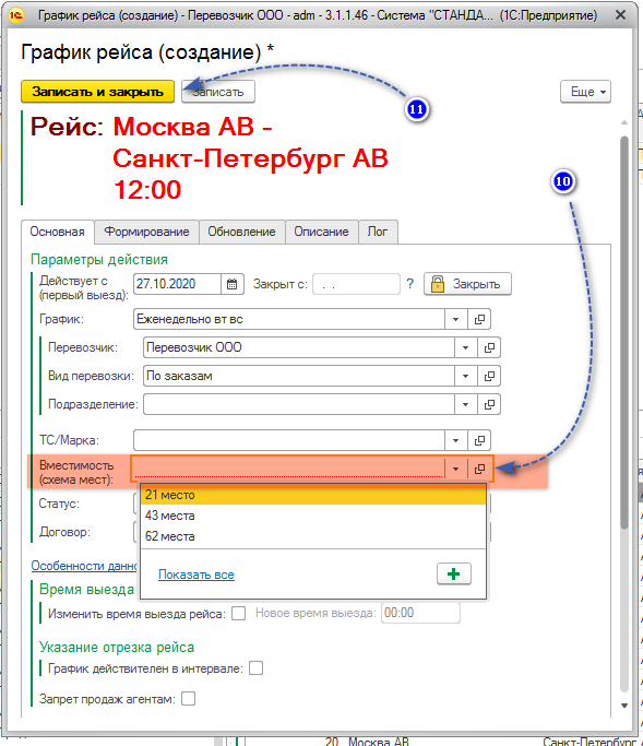 Указываем вместимость ТС. По умолчанию указываем минимальную из возможных по этому рейсу.
