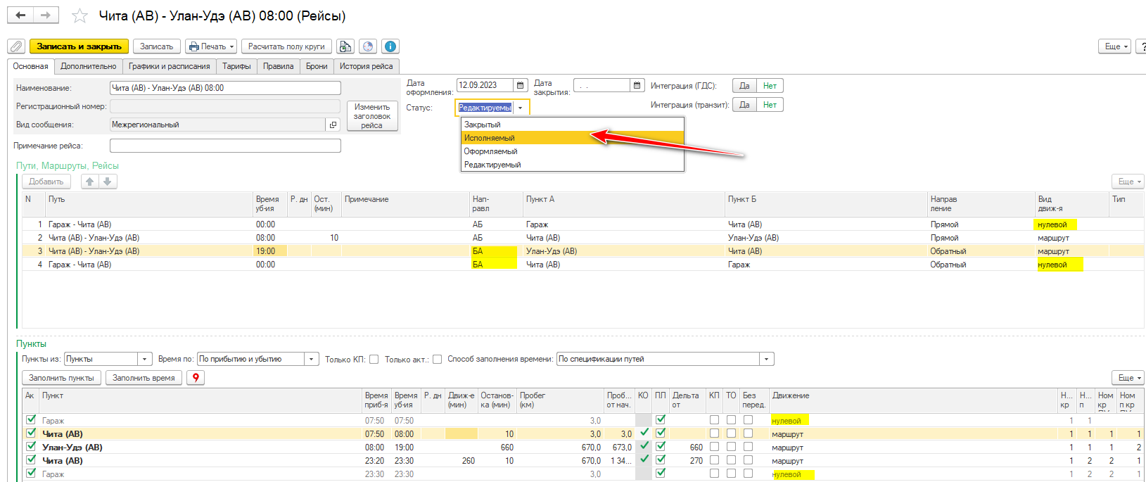 Установите прямое и обратное направление. Укажите время прибытия и убытия, пробег. Переведите создаваемый рейс в Исполняемый статус.