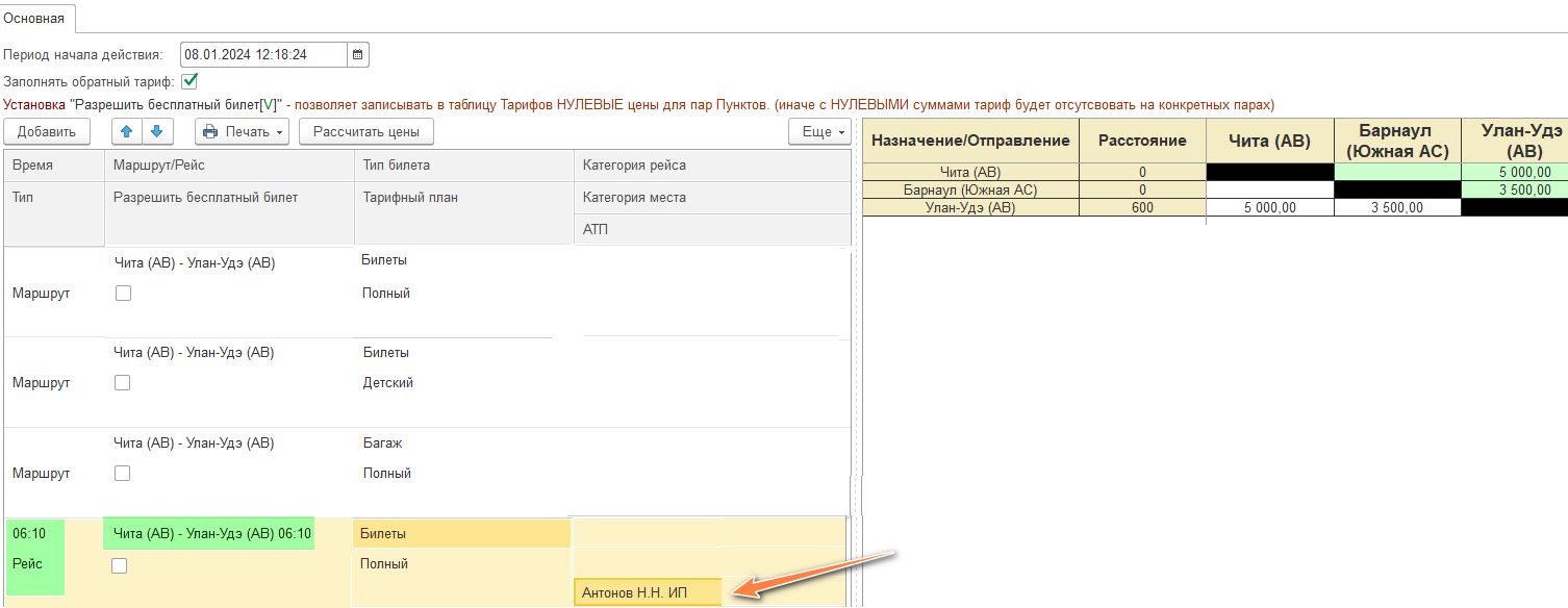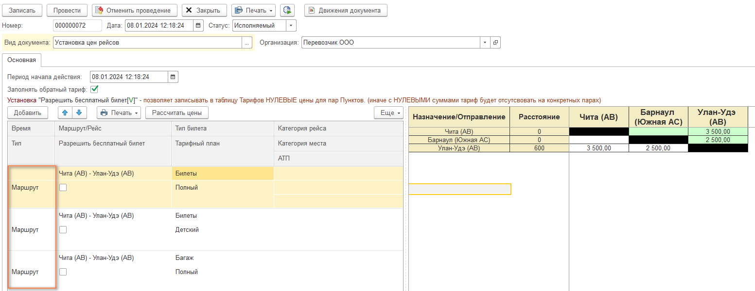 Когда по одному маршруту в течение дня ходит несколько рейсов и имеют одинаковые тарифы, а Вы хотите назначить на один рейс специальную цену, то необходимо создать отдельный тариф для рейса.