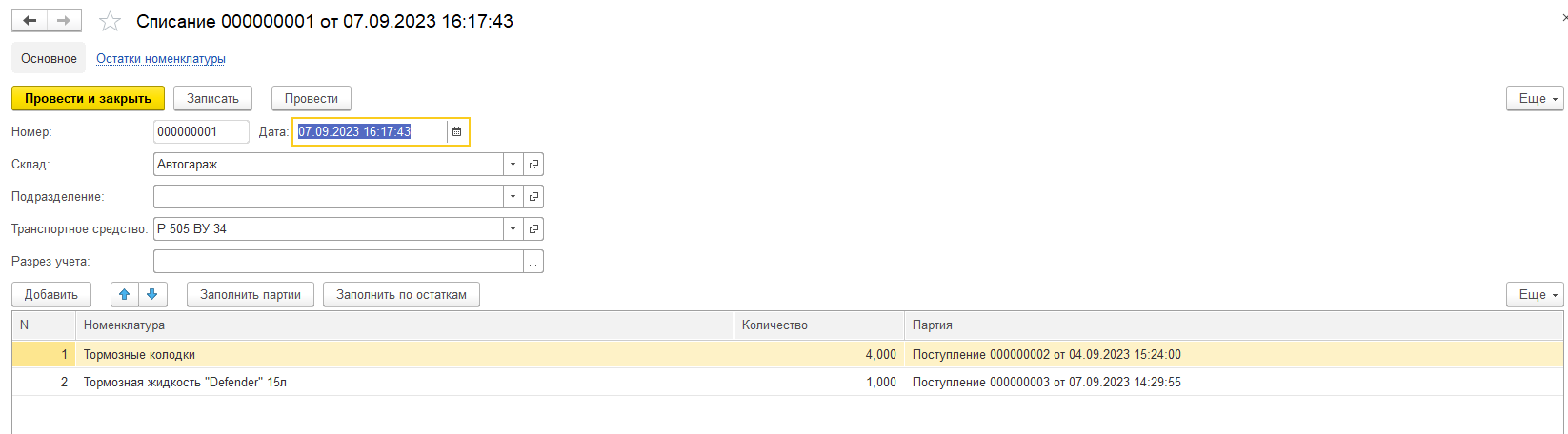 Списание материалов Меню Склад - Создать - Списание материалов Создается автоматически на основании документа Ремонтный лист. Списание будет отражено в отчете по материалам.