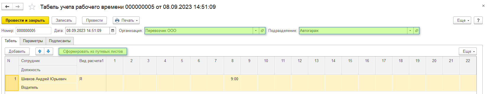 Меню Управление Транспортом - Документы - Табель учета рабочего времени - Создать