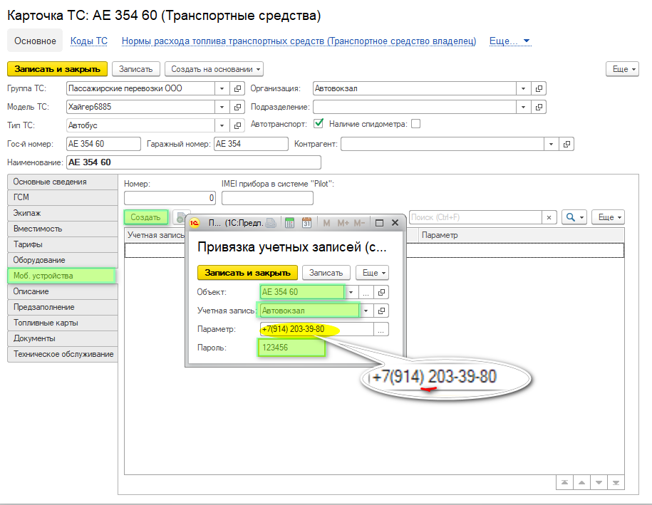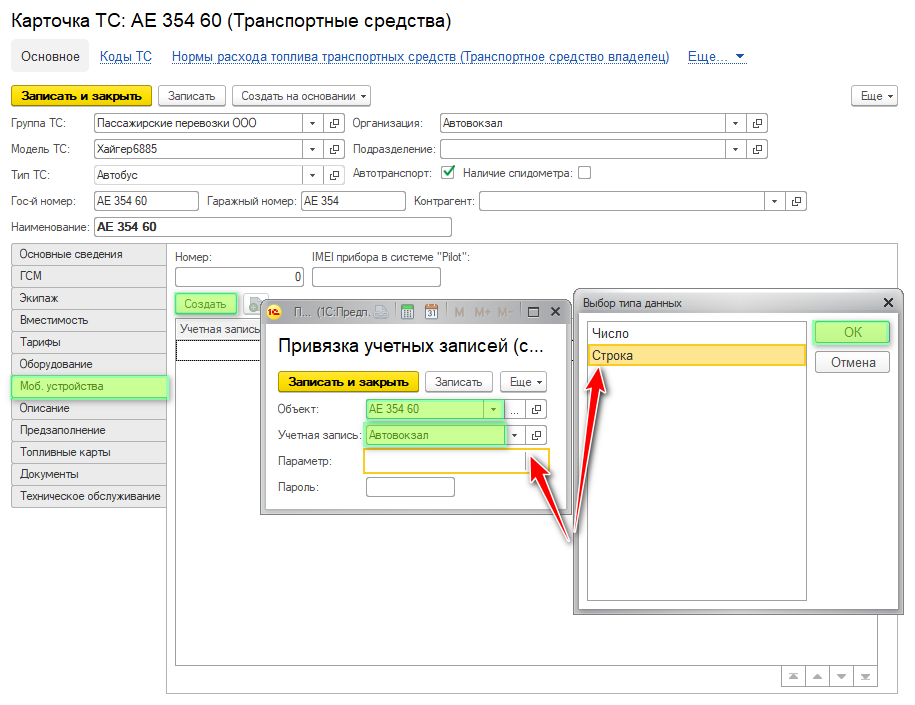 На вкладке Моб.устройства нажмите кнопку Создать. Установите учетную запись Автовокзал, щелкните на три точки в конце строки параметр. Выберите тип данных Строка. Нажмите ОК. Впишите в параметре номер телефона с сим-карты, которая будет в планшете.