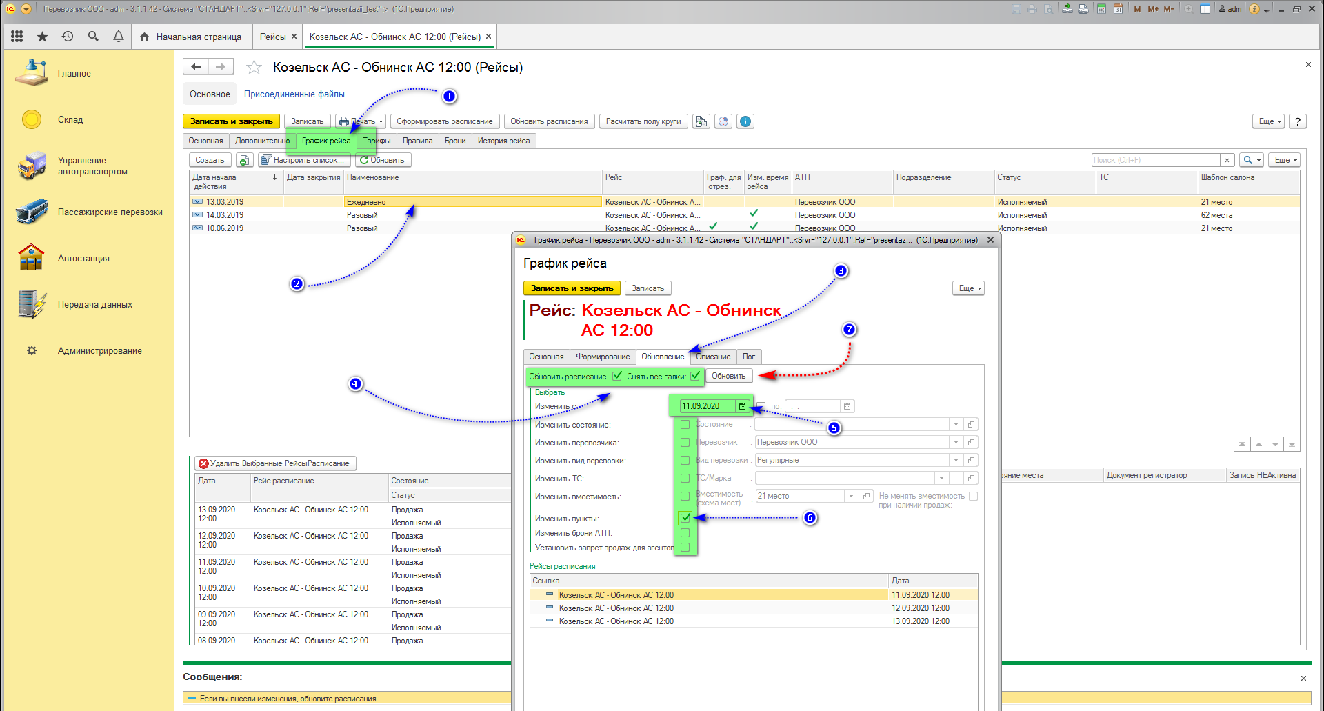 6. Дата совпадает с датой начала действия рейса и указать нужный параметр обновления – «Изменить пункты».