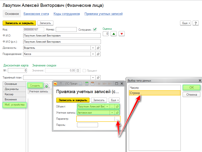 Выберите тип данных Строка. Нажмите ОК. Впишите в параметре номер телефона. Установите свой пароль. Нажмите Записать и закрыть.