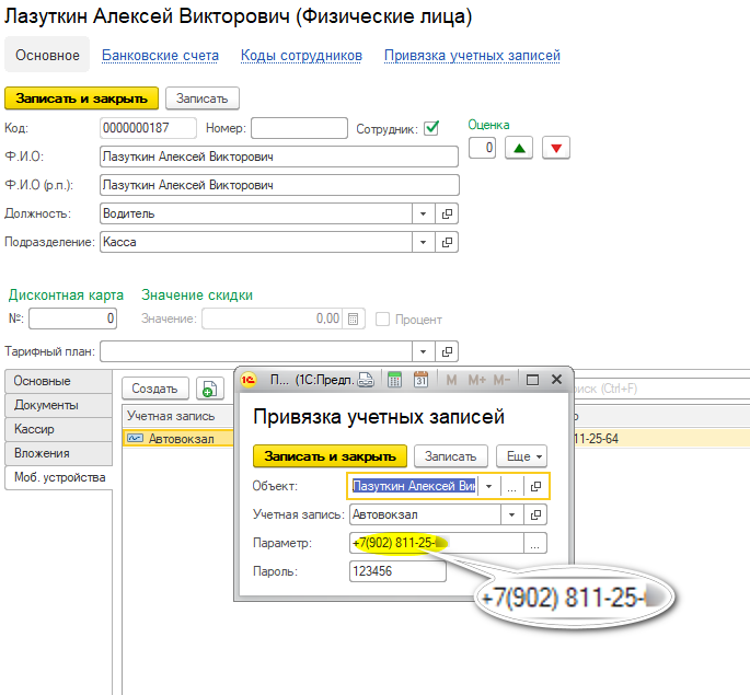 На вкладке Моб.устройства нажмите кнопку Создать. Установите учетную запись Автовокзал, щелкните на три точки в конце строки параметр.