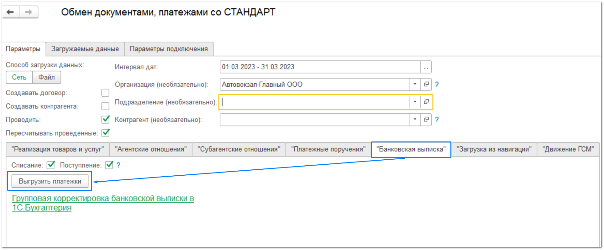 Выгрузка банковской выписки (из 1C-Бухгалтерия в АТП-СТАНДАРТ)