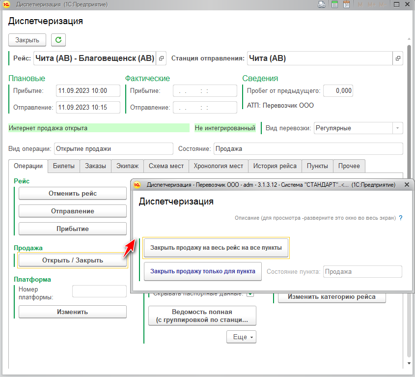 Закрытие продажи билетов ручную Меню Автостанция - Диспетчеризация - Диспетчеризация Вкладка Операции - Продажа - Открыть/Закрыть Закрытие продажи на рейс не отменяет рейс, а приостанавливает продажу билетов.