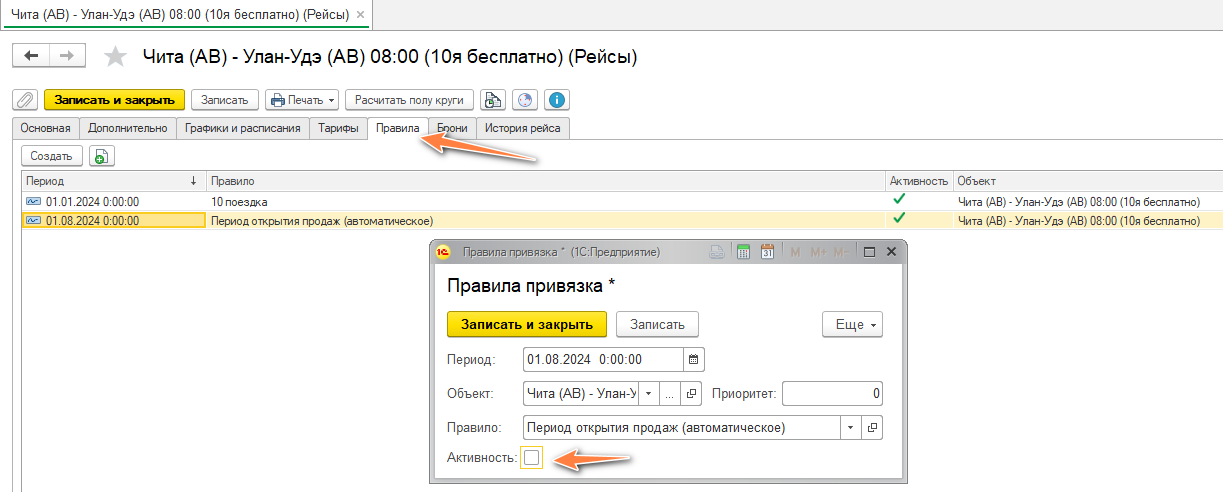 Перед закрытием рейса необходимо убедиться, что правило автоматического формирования расписания у рейса неактивно.