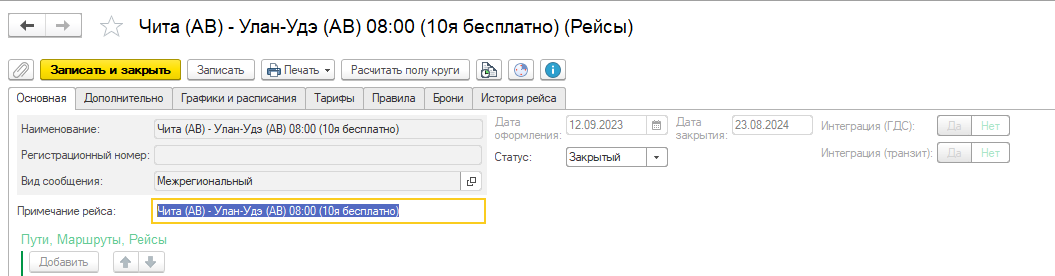Переключитесь на вкладку "Основная" в рейсе. Выберите дату закрытия рейса, которая должна совпадать с датой закрытия графика или быть более поздней.