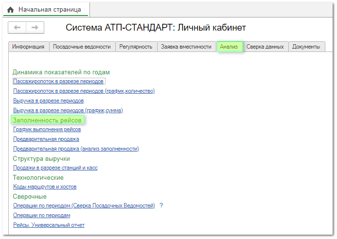 Заполненность рейсов Раздел отчетов "Заполненность рейсов" позволяет нам проанализировать график выполнения рейсов и предварительную продажу в разные периоды времени. Вкладка Анализ - Заполненность рейсов.